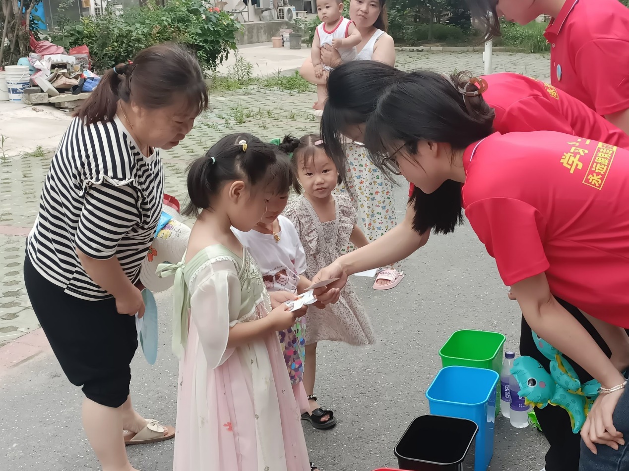 活动伊始,队长陶雨濛向各位队员分发了不同垃圾的卡片和写有四个垃圾种类的桶,并分配任务。接着,队员们有礼貌地向社区居民表明身份和解释来意,征得社区居民的同意后,与小朋友进行游戏。首先,将写有不同垃圾的小卡片发给小朋友让小朋友们依次投入桶中,投入后队员会再告知小朋友投的是否正确,若不正确会告知正确答案。之后,送给小朋友动物气球以表示参与活动的鼓励与奖励。