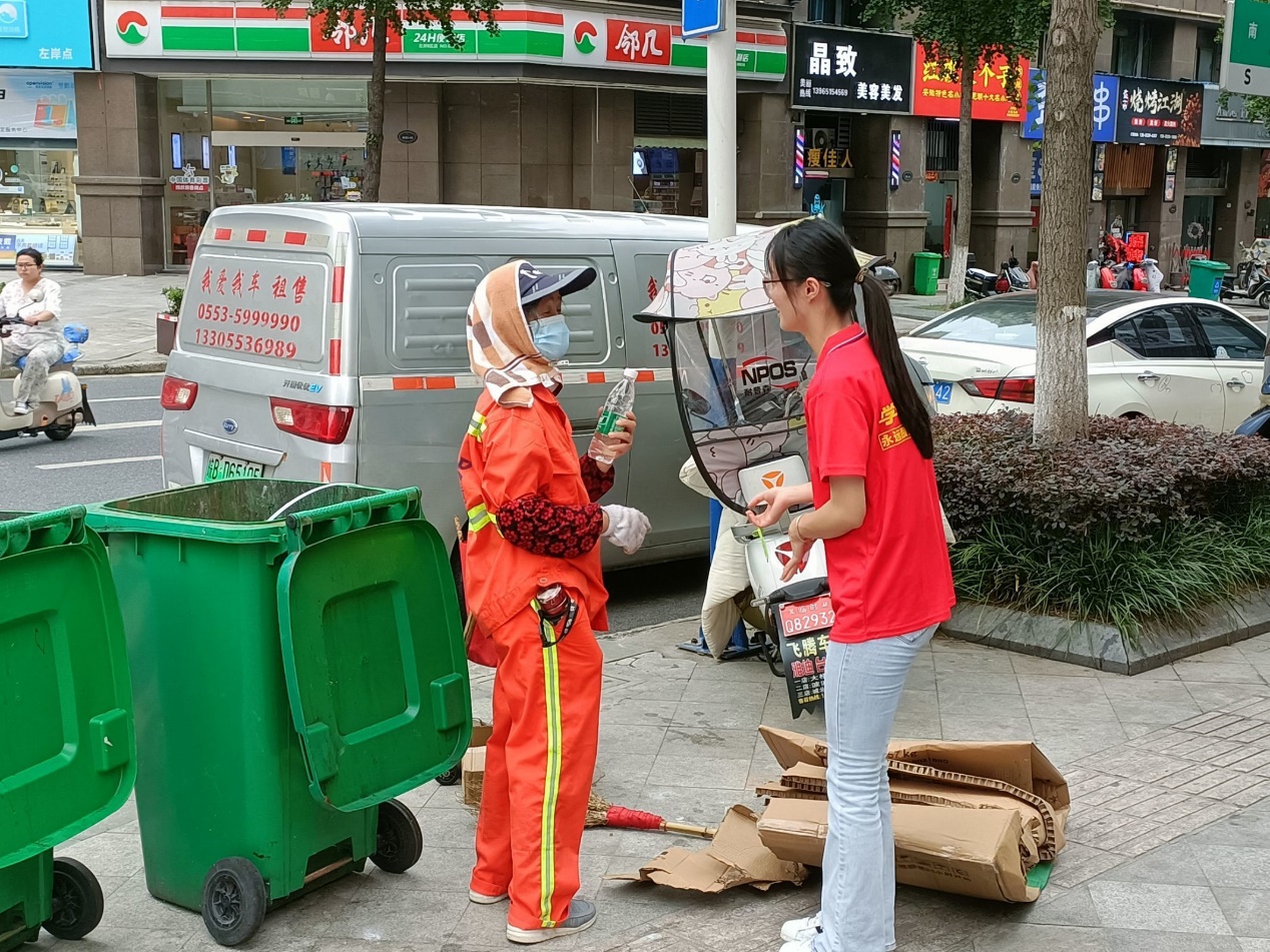 活动伊始,队长陶雨濛向各位队员分配任务,强调一些任务细节。接着,陶雨濛带领队员们向环卫工人及外卖员说出自己的感谢并向他们送水来表达自己内心的敬意,叔叔阿姨们也开始拉着队员们聊天,告诉我们他们的喜悦、向我们分享他们的日常生活。