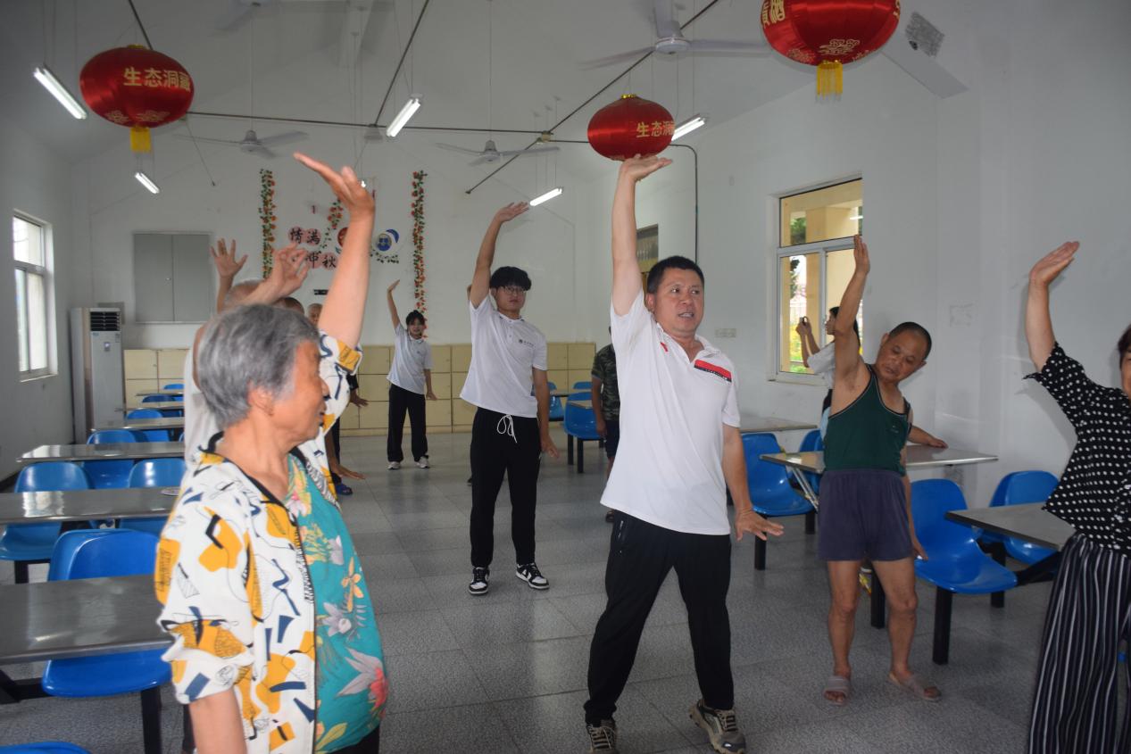 八段锦具有养生保健、强身健体的功效与作用,可以疏通经络、调理三焦、健脾和胃以及行气活血,是一套结合形体活动与呼吸的健身方法,对身体有益。文化宣传团队成员在团队指导教师陈永军的带领下,指导敬老院老人进行简单的八段锦招式。
