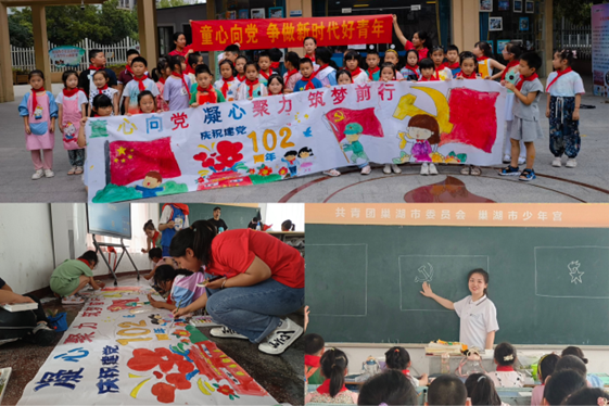 7月15日上午,实践团成员前往巢湖市巢湖少年宫开展“红心向党,绘出未来”主题活动。活动中,实践团队成员以党史为切入点,带领同学们回顾党的百年奋斗历史和发展成就,畅享对祖国未来的期望,引领孩子们积极表达自己对祖国的热爱。期间,实践团队成员们带领同学们进行集体绘画,孩子们激情高昂,互相热烈地讨论着,每个孩子的想法各不相同,国旗、天安门、红领巾,中国结跃然纸上。同时,孩子们在老师和实践团成员的帮助下仔细上色、认真涂改,并且按下手印,最终完成了绘画创作。