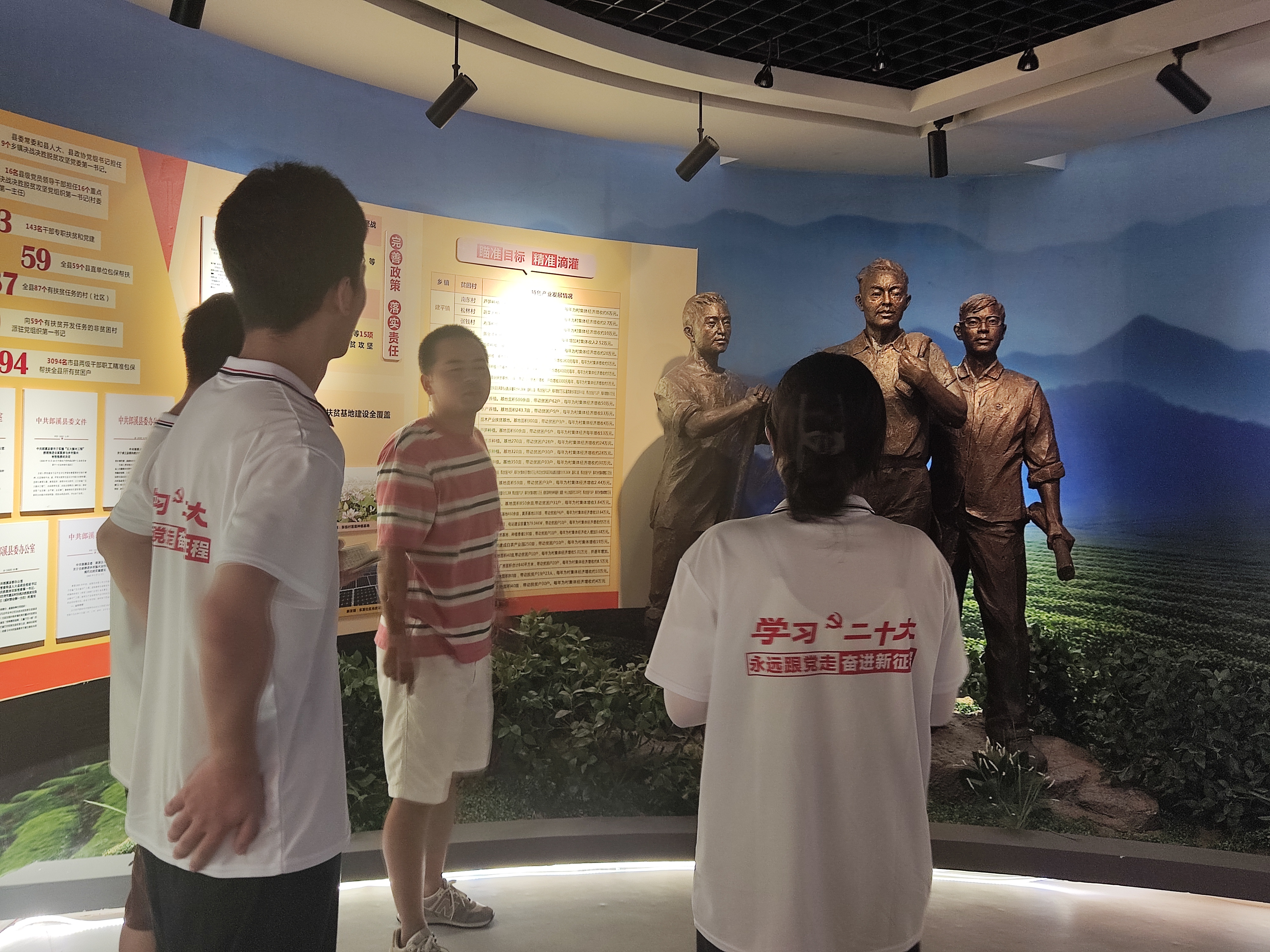 7月2日,寻访团来到了位于凌笪乡下吴村的宣城市记录小康工程展馆,乡村振兴工作不仅要做好脱贫攻坚成果巩固,更要在防返贫上下功夫。在村干部王鹏主任的带领下,实践团参观了展馆。通过一篇篇文字、一组组数据、一张张图片让大家深刻感受到了在党的领导下,在实施乡村振兴战略的背景下下吴村的脱贫攻坚历程。现如今,下吴村通过充分发挥区位及生态资源优势,寻求新的发展空间、学习先进理念、复制先进技术、引进先进方法,大力发展茶叶种植生产,走稳振兴路。