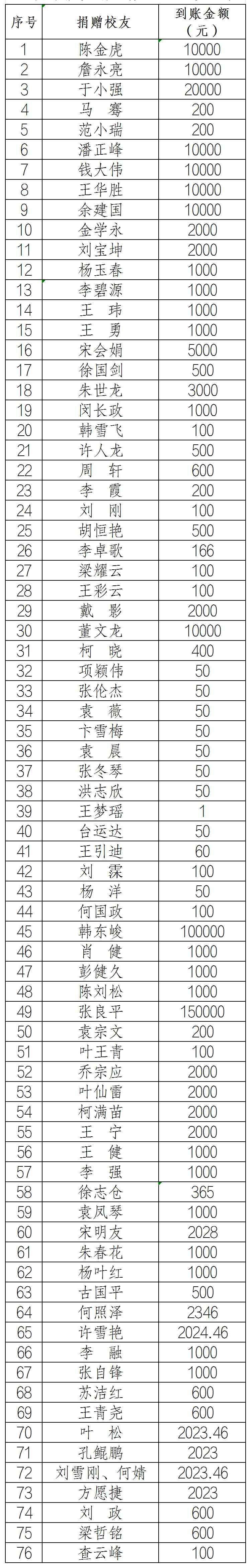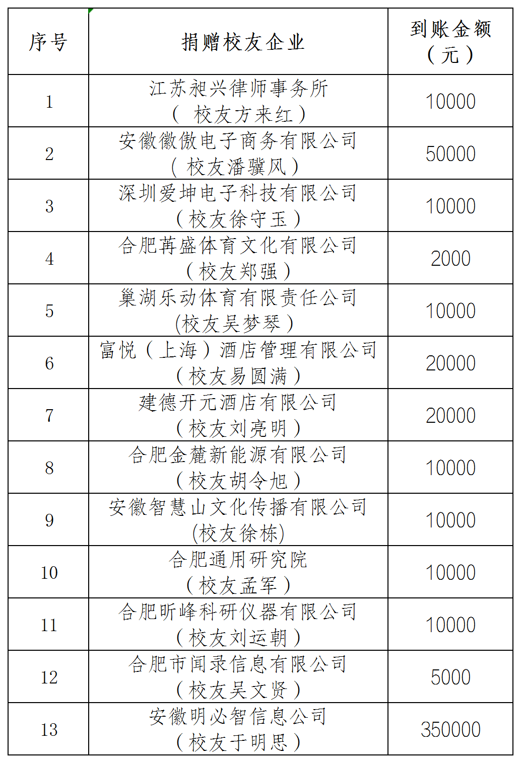 还有部分校友匿名捐赠,在此向所有捐赠校友表示感谢。有问题请联系校友办公室杨老师:0551-82361509。