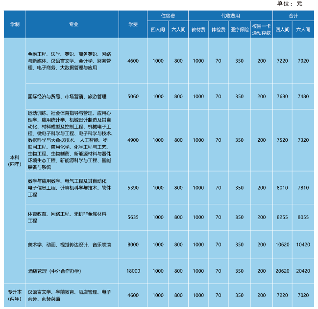 (1)住宿费标准为:六人间800元/生,四人间1000元/生,宿舍由学校统一安排,请全体新生以宿舍安排结果按相应标准缴纳住宿费。