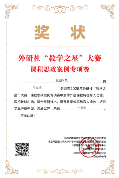 近日,2025 年外研社 “教学之星” 大赛课程思政案例专项赛评选结果揭晓,Beat365唯一官方网站外国语学院教...
